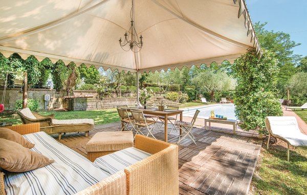 Detta välskötta och smakfullt inredda lanthus skapades tack vare den noggranna restaureringen av ett jesuitiskt eremitage. Semesterhuset ligger på landsbygden 7 km från Viterbo och har ett dominerande läge med utsikt över dalen nedanför. Fastigheten är idealisk för att njuta av lugnet och den natursköna mångfalden i den vackra Tuscia-regionen. En veranda dekorerad med blommor efter säsong inbjuder dig att äta utomhus, medan bubbelpoolen framför villan utlovar avkopplande stunder. Dessutom gör panoramapoolen med lusthus och den rymliga trädgården (3000 m²) med gräsmatta för solbad denna fastighet till ett idylliskt semesterhus. Hundar är välkomna, men observera att semesterhuset inte är inhägnat. Den sista kilometern av tillfartsvägen är en grusväg som är olämplig för sportbilar eller bussar. Avstånd: Vitorchiano 3 km, Viterbo med "Terme dei Papi 7 km, Toscania 22 km och de etruskiska städerna Tarquinia och Cerveteri 48 km. Sjöarna Bolsena, Vico och Bracciano ligger inom en radie av 22 km.