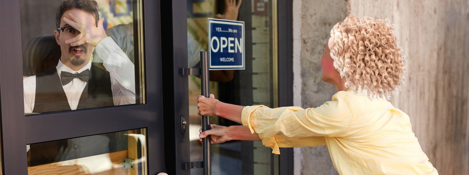 behövde ett rejält ryck för att med ett brak öppna sig så vi kunde komma in. Hovmästaren, servitrisen, kocken och diskaren hade kommit utrusande och stod på led och gapade. När vi, dvs. jag för Mannen gapade han med, sade att vi ville ha ett bord för två fick servitrisen fram att allt var reserverat och att de inte öppnade förrän klockan åtta.