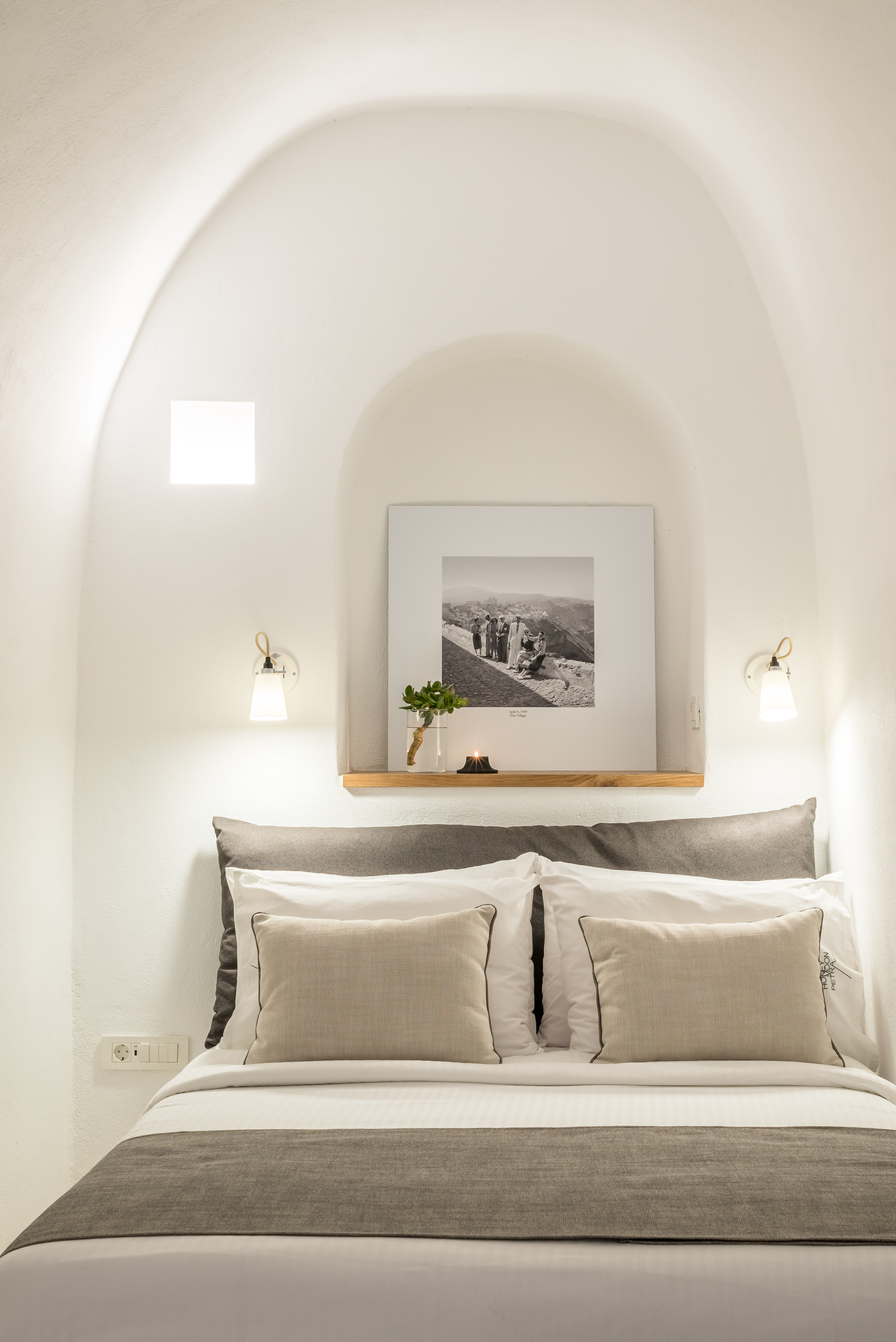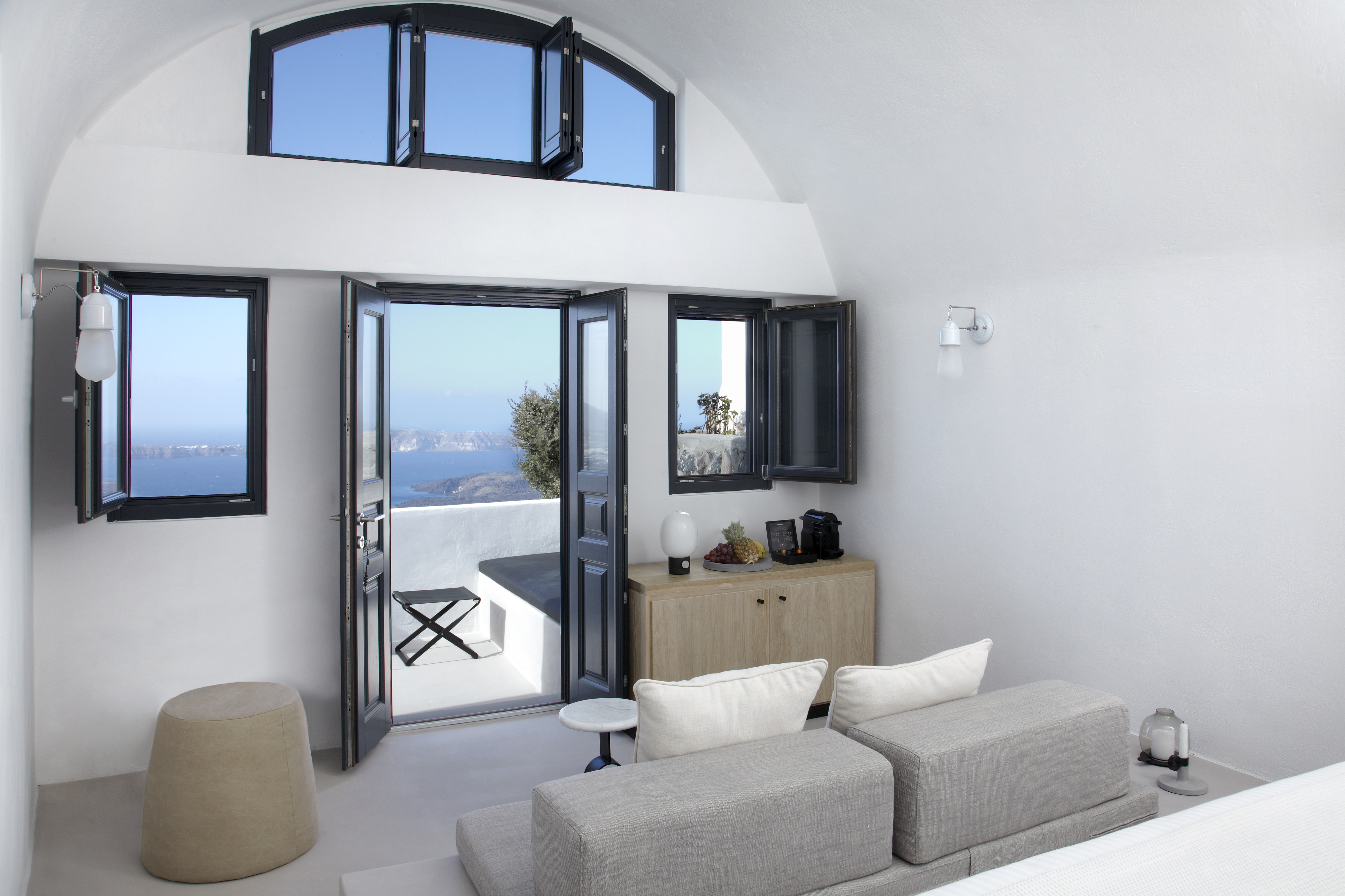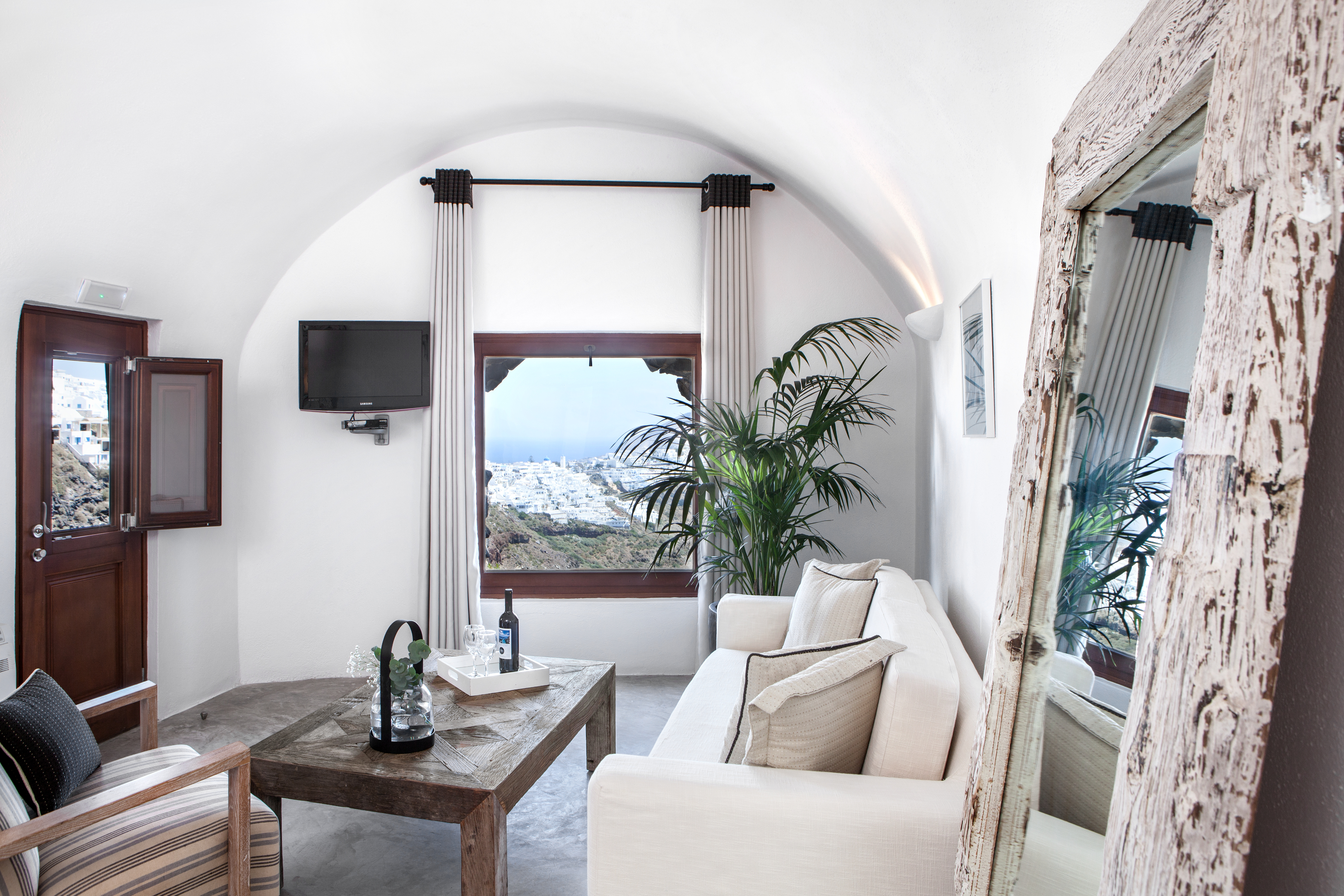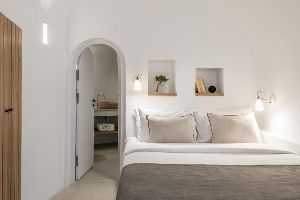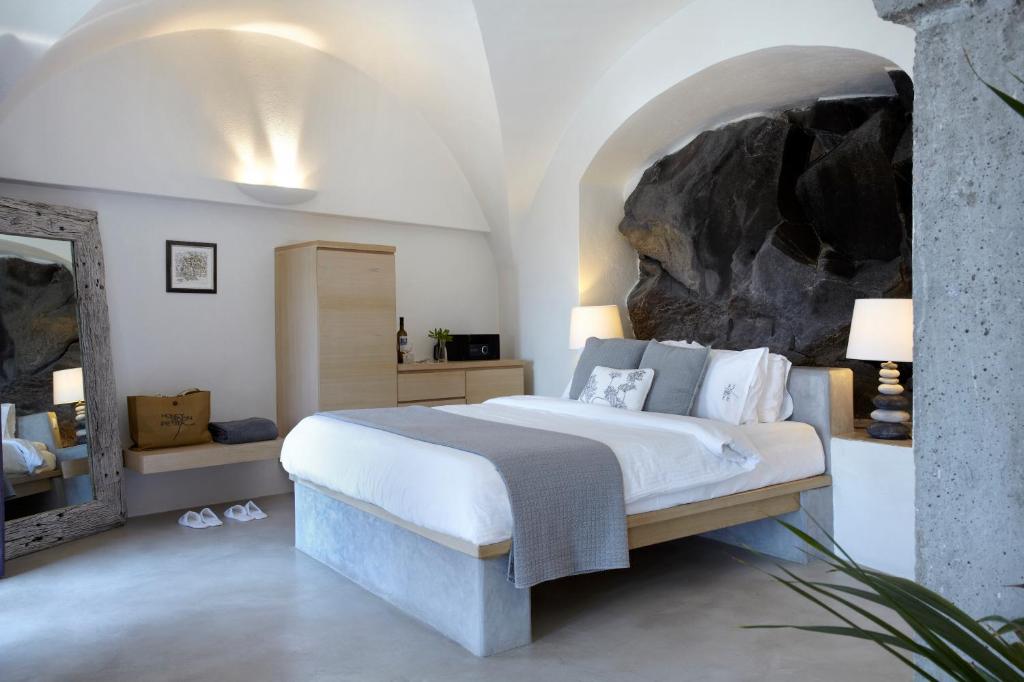 Detta charmiga femstjärniga hotell ligger i Imerovigli, högt uppe på kalderaklipporna, omgivet av hisnande naturlandskap. En kort fem minuters promenad leder till Imeroviglis centrum, med dess restauranger, butiker, apotek och busstation. Firas livliga nattliv ligger bara 1, 9 km bort, och flygplatsen ligger cirka 12 km från hotellet. Den antika fästningen Skaros ligger bara 1 km bort. Hotellet består av två flyglar och erbjuder totalt 25 lägenheter. Den traditionella flygeln, högre upp på klippan, har sju studior och sviter inbyggda i berget, vilket minimerar tillgången till trappor. Petra-flygeln, närmare de viktigaste faciliteterna, erbjuder 18 studior och sviter byggda av vulkanisk sten. Renoverat 2018 erbjuder detta luftkonditionerade hotell en 24-timmars lobby och poolbar, en à la carte-restaurang, Wi-Fi, parkering, concierge, rumsservice och tvättservice. Alla rum har en fenomenal utsikt över kalderans södra sida och vulkanen. Medan varje rum/svit har en privat uteplats med solstolar, behåller den öppna designen en obehindrad utsikt. Bekvämligheter inkluderar luftkonditionering, smart/satellit-TV, minibar, direkttelefon, handdukar, hårtork, en Nespresso-maskin, schampo och balsam, Wi-Fi och ett laptopsäkert värdeskåp. Som gäst kan du njuta av utomhuspoolen, poolbaren, soldäcket och solstolarna, allt perfekt placerat för spektakulära solnedgångar. En plunge pool och ångbastu finns också tillgängliga. En frukostbuffé serveras dagligen från 8:00 till 10:30. Observera: Besökare är inte tillåtna på fastigheten och barn under 14 år är inte tillåtna.