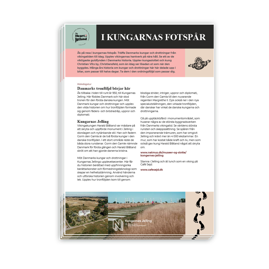 Åk på en resa i de danska kungarnas fotspår, där du kan uppleva något av det bästa som Jyllands hjärta har att erbjuda! Kom och lev dig in i historien - se Danmarks födelsebevis, upplev hur kungamakten manifesterade sitt grepp om danernas rike med våldsam kraft. Kungarnas Jelling tar dig tillbaka till dåtiden!