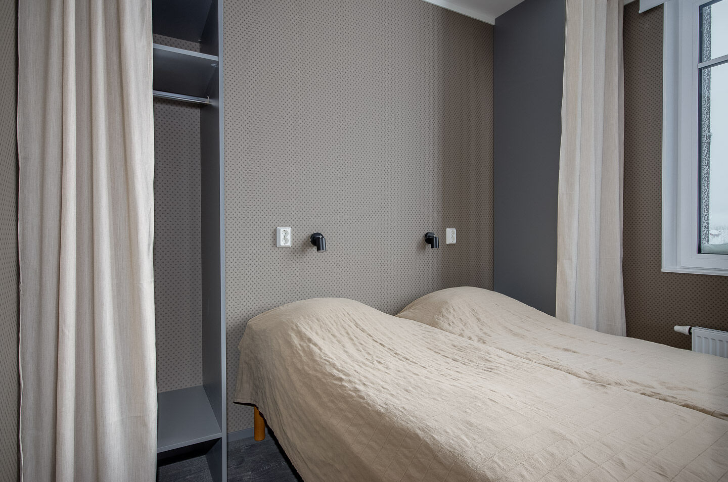 Sovrum I ett sovrum finns en dubbelsäng och i de båda andra finns en våningssäng. Notera att två av sovrummen inte har fönster.