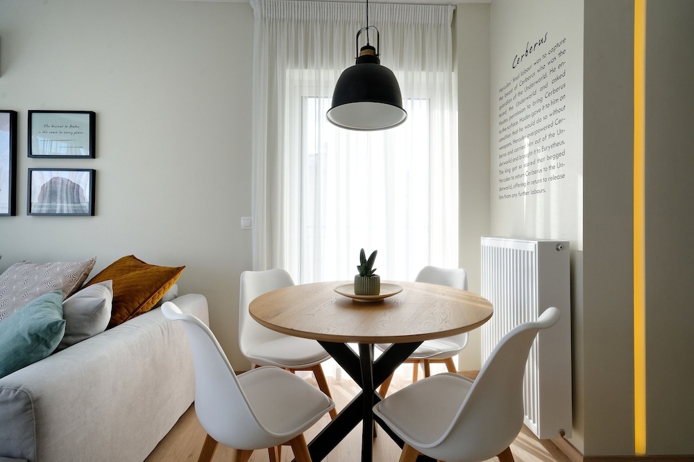 Hercules Residence placerar dig mitt i Aten, med tio minuters promenadväg till Technopolis och Agora. Denna lägenhet ligger 1,6 km från Monastiraki loppmarknad och 3 km från Syntagmas torg. Känn dig som hemma i ett av de 12 individuellt inredda rummen som har kök med stor kyl/frys och ugn. Sängen har bäddmadrass och sängtillbehör av högsta kvalitet. Gratis wi-fi ser till att du kan hålla dig uppkopplad, och en 43-tums smart-tv med kabelkanaler erbjuder all underhållning du behöver. På rummet finns laptopanpassade värdeförvaringsskåp och mikrovågsugnar. Städning erbjuds på begäran. Avstånd avrundas till närmsta decimal.