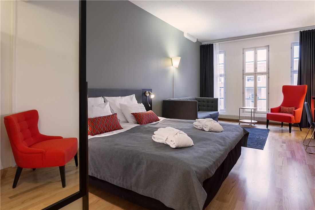 Här bor du bekvämt vid havet precis intill salutorget och Helsingfors centrum. Hotellet är beläget i en vacker lagerbyggnad från tidigt 1900-tal och har rymliga rum och en rofylld atmosfär. Stora fönster och hög takhöjd skapar en ljus och luftig känsla i lobbyn, restaurangen och baren.