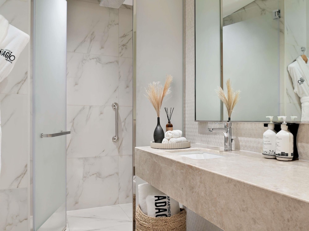 I Dubai-området Palm Jumeirah ligger Adagio Premium The Palm en tio minuters bilfärd från både Dubai Marina Mall och The Walk. Detta lägenhetshotell vid stranden ligger 6,5 km från Marina Beach och 7,2 km från Wild Wadi Water Park. Känn dig som hemma i ett av de 163 rummen som har pentry med stor kyl/frys och spishäll. Gratis wi-fi ser till att du kan hålla dig uppkopplad, och en 49-tums LED-tv med satellitkanaler erbjuder all underhållning du behöver. På rummet finns telefon, laptopanpassade värdeförvaringsskåp och skrivbord. Avstånd avrundas till närmsta decimal.