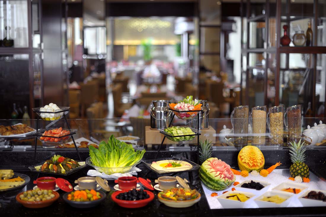 Hotellets huvudrestaurang serverar internationella rätter och håller öppet hela dagen. Vill du prova på Asian fusion finns restaurangen ”Ginger” med spännande rätter från hela Asien. Här finns också ett café och pub som serverar enklare tilltugg.