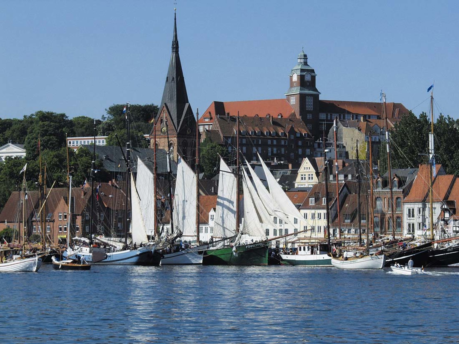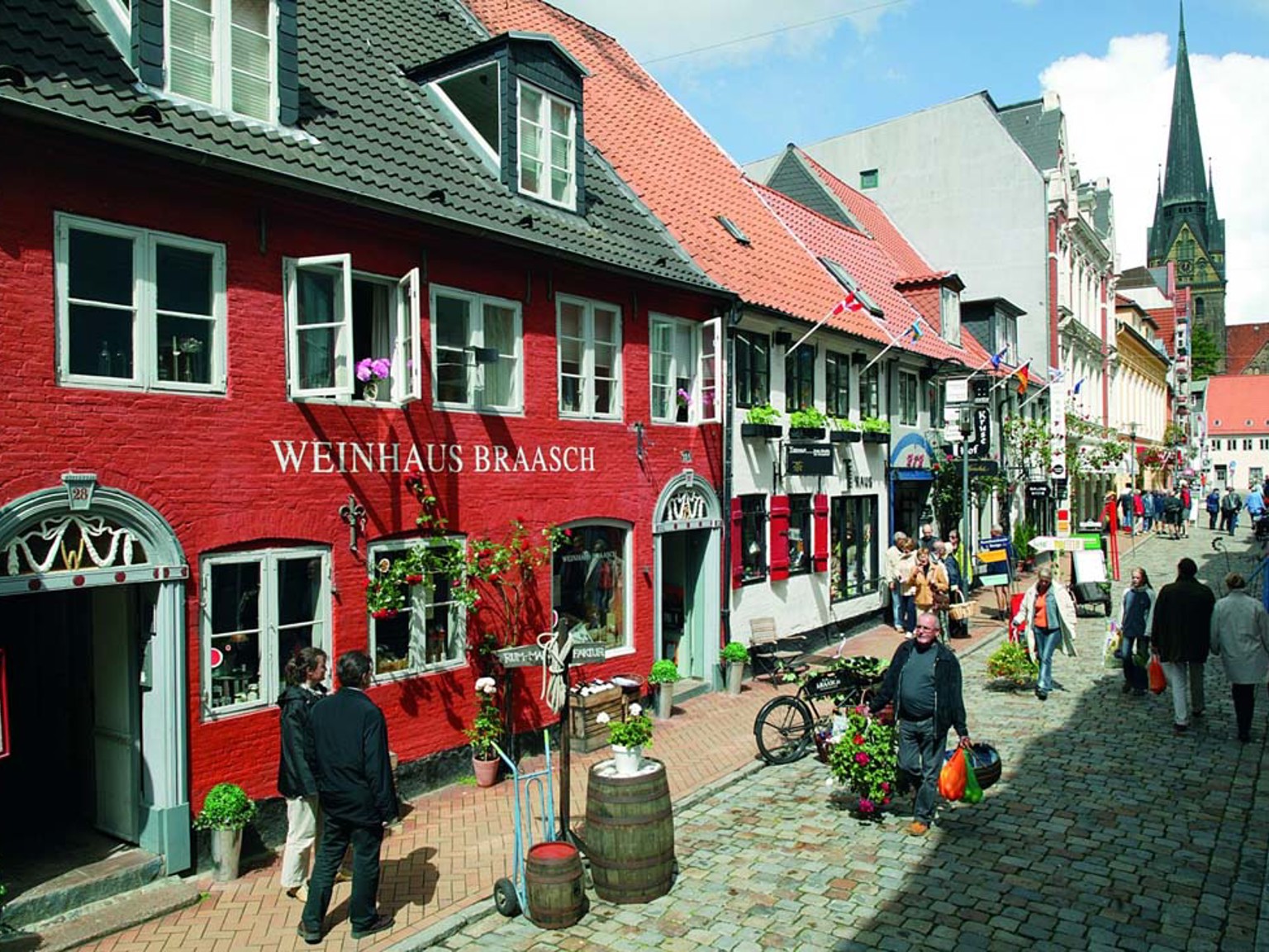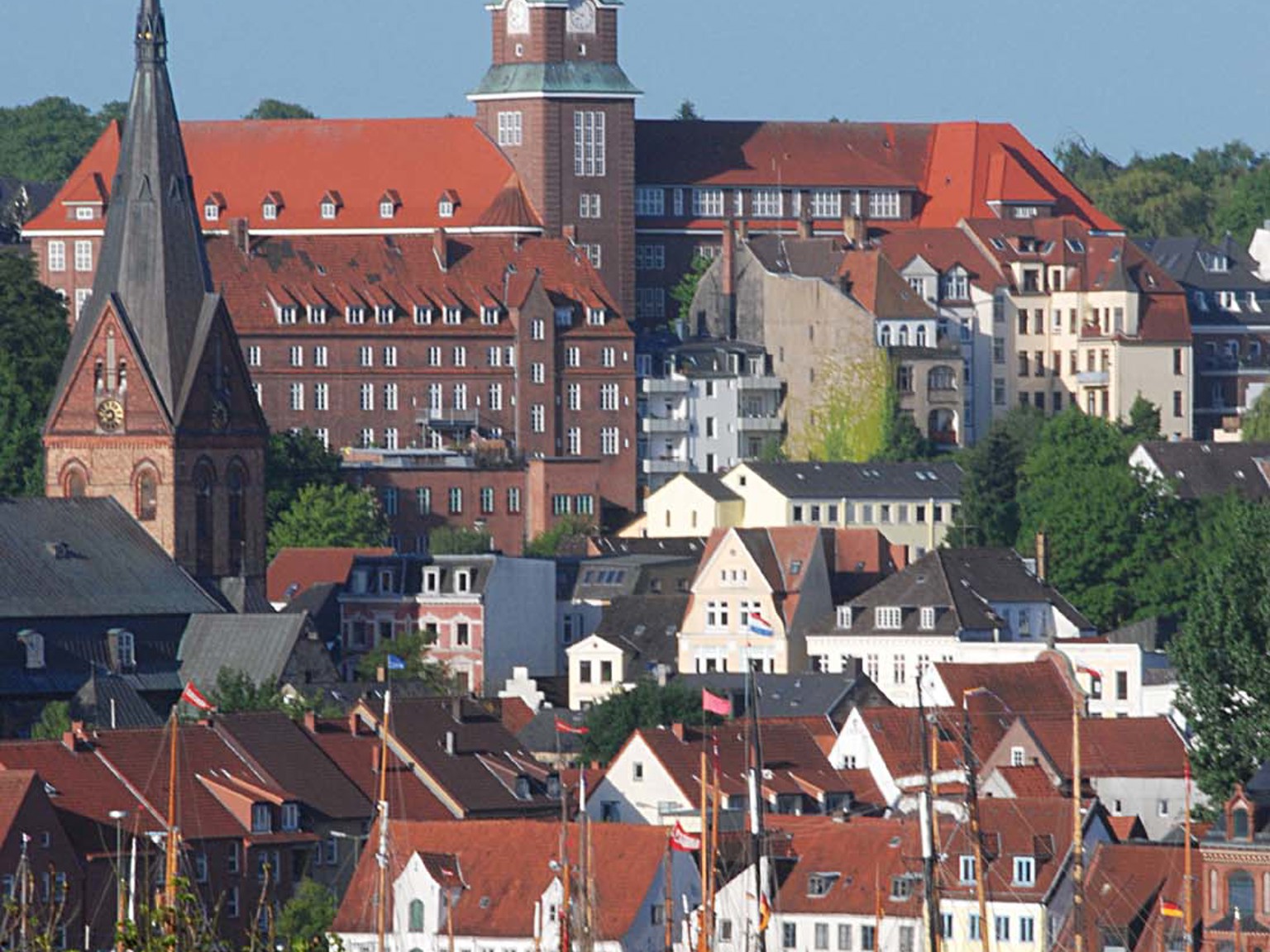 Flensburg ligger omedelbart söder om gränsen mot Danmark och har även tillhört Danmark (hette då Flensborg). Ligger vid Flensburger Förde (fjord), som är fint för segling. Flensburg är en av de tyska städer, som klarade sig praktiskt taget utan skador under andra världskriget. Staden var sedan säte för Nazitysklands sista regering (2-23/5 1945) under ledning av storamiral Karl Dönitz. Nyrenoverade gågator sträcker sig genom innerstan med flotta husfasader, många butiker och caféer. Dessutom finns det en del karakteristiska bakgårdar som i dag rymmer restauranger och små butiker. En liten pärla är Rote Strasse med sina bakgårdar. Staden firade 725 års jubileum som köpmannastad 2009. Flensburg har ett av Europas bästa handbollslag.