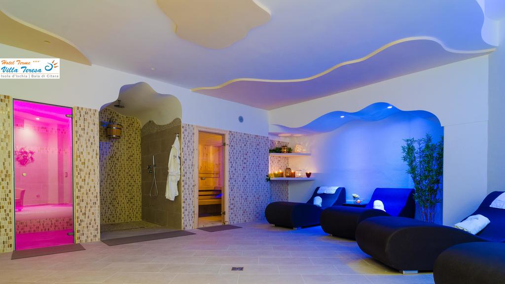Med utsikt över Citara Bay erbjuder Villa Teresa havsutsikt från sin utomhuspool. Hotellet ligger på södra delen av ön Ischia, bara 10 minuters bilresa från Ischia centrum. Hotel Terme Villa Teresa har ett eget termiskt spa där du kan njuta av en mängd olika skönhets- och hälsobehandlingar. Inomhus- och utomhuspoolerna fylls dagligen med Ischias underjordiska termiska vatten. Villa Teresa Terme har rum med satellit-TV och eget badrum. Alla rum har utsikt över poolen, havet eller bergen.