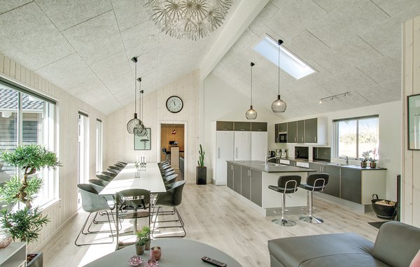 På Djurslands nordkust, i Fjellerup, i ett härligt ostört, inhägnat semesterområde, väntar detta stora semesterhus med pool och bubbelpool på dig. Här kan ni tillbringa en oförglömlig semester där ingen behöver ha tråkigt. Njut av livet i det stora vardagsrummet, som är praktiskt taget öppet i anslutning till köket. Det finns trevliga sovrum och moderna badrum. Koppla av på terrasserna, där du kan välja mellan sol, skugga och vindskydd, eller gå till stranden, där det finns gott om plats för att ligga i solen hela dagen. Trålarna kommer förbi här varje dag med sin färska fångst. I området finns det många skogar, slott och små vägkanter där du kan köpa nyskördad frukt och grönsaker. Gör också en utflykt till Djurs sommarland med många aktiviteter för hela familjen. I den mysiga handelsstaden Grenå kan du ta en promenad över torget framför kyrkan eller längs hamnen och titta på hajarna på Kattegattcentret.