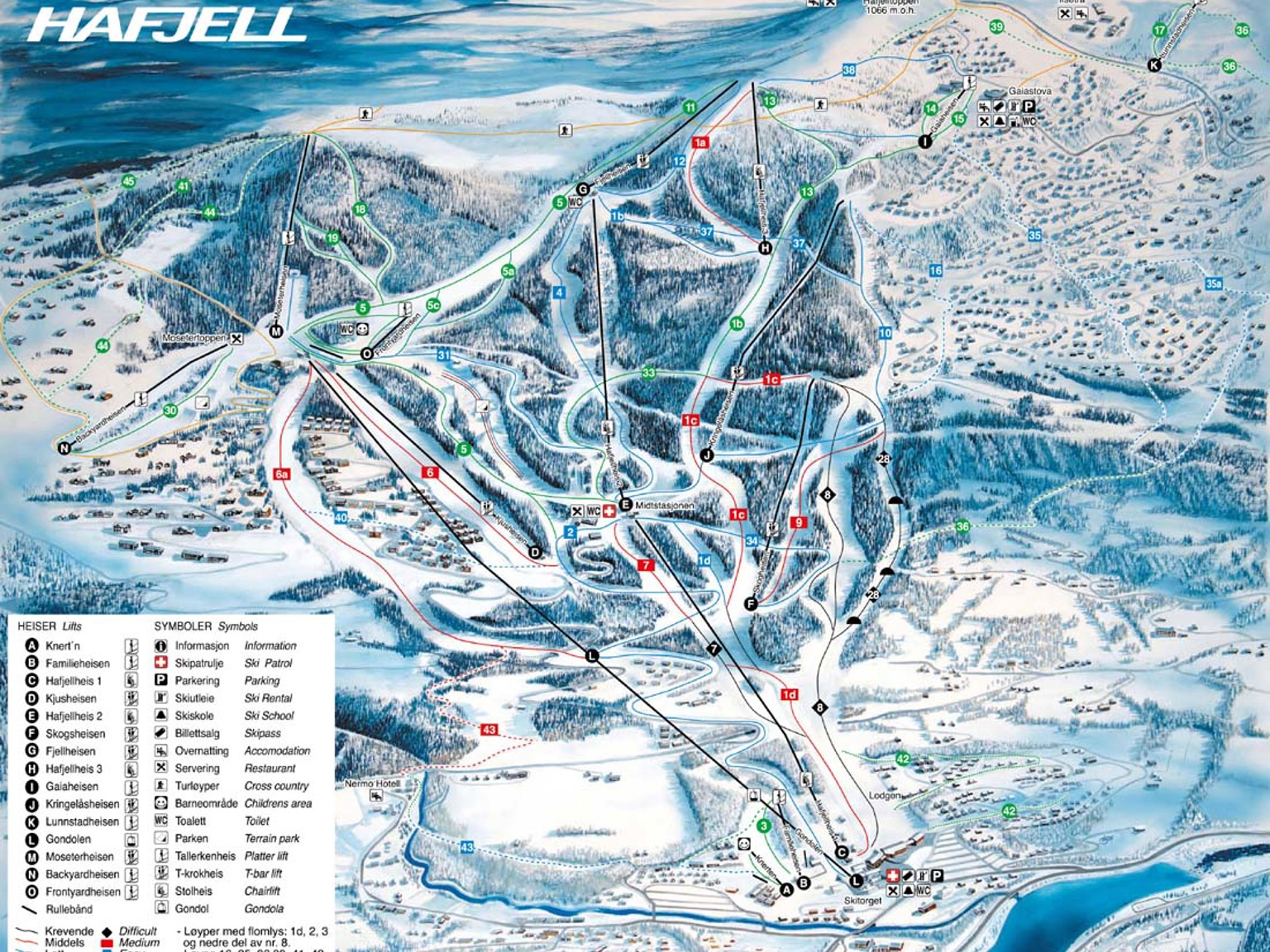 I Hafjell finns 30 nedfarter och 13 liftar vilket gör Hafjell till ett unikt skidområde. Här finns liftsystem med bland annat en 8-sitsig gondollift och 2 EXPRESS-liftar. Det är på så sätt enkelt och effektivt att ta sig upp i backarna och minimerar risken för långa köer. Det ger också nybörjare och mindre erfarna åkare utökade möjligheter. Med gondolliften får du tillgång till både gröna, blåa, röda och svarta pister. Hafjell passar alla typer av skidåkare, dels de som njuter av att åka i de ”mjuka” backarna och de mer erfarna åkarna.