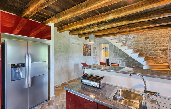 Från Villa Zvonar, som ligger på en grön sluttning i hjärtat av centrala Istrien, ser man oemotståndliga idylliska, skogsklädda kullar med olivlundar, pittoreska byar och autentiska bondgårdar. Ett traditionellt stenhus har renoverats kärleksfullt och noggrant för att behålla sin ursprungliga charm och lugn, till vilket moderna faciliteter har lagts till, inklusive vackert inredda badrum, Wi-Fi och golvvärme. Bottenvåningen erbjuder en rymlig öppen planlösning vardagsrum och matsal med ett fullt utrustat kök så att du kan våga ut för att laga några av de lokala recepten. Träbjälkar i taket, naturstensväggar och en mysig öppen spis ger en behagligt inbjudande rustik atmosfär, medan de stora panoramafönstren släpper in mycket naturligt ljus och betonar den oändliga utsikten. De tre smakfullt inredda sovrummen ligger på övervåningen, varav två har privata terrasser som fungerar som idealiska lugna hörn. Samma omsorg och uppmärksamhet har ägnats åt utomhusområdet, där du hittar en ekologisk trädgård. Den stora gräsmattan pryds av en mängd olika blommor, samt lavendel- och rosmarinbuskar, och omger den inbjudande poolen. Här kan man verkligen njuta av lugnet och den unika skönheten i denna magiska region. Utomhusjacuzzin står till ert förfogande.