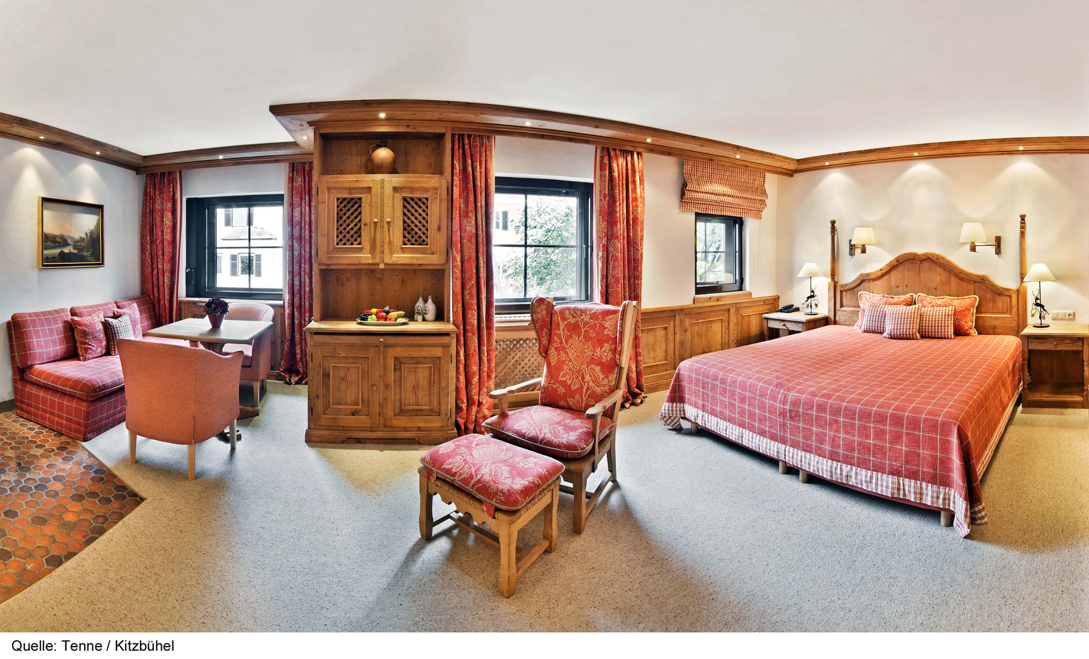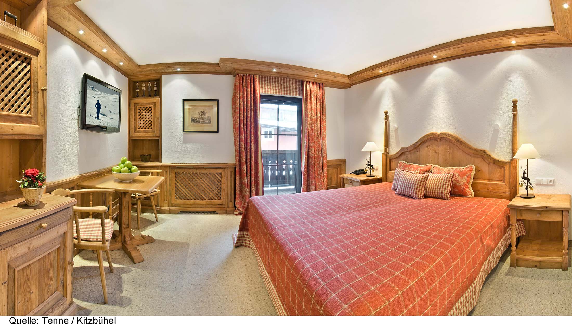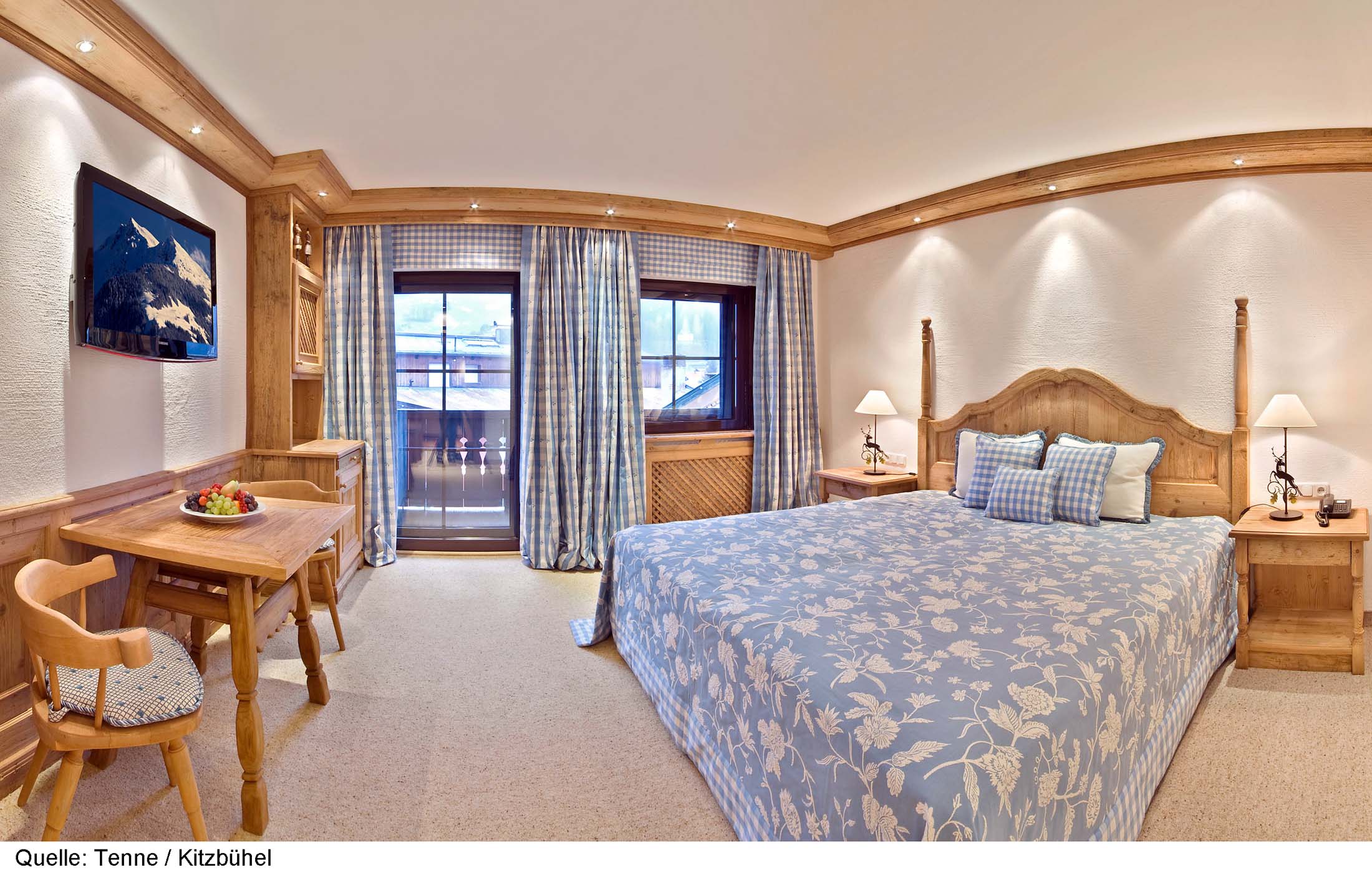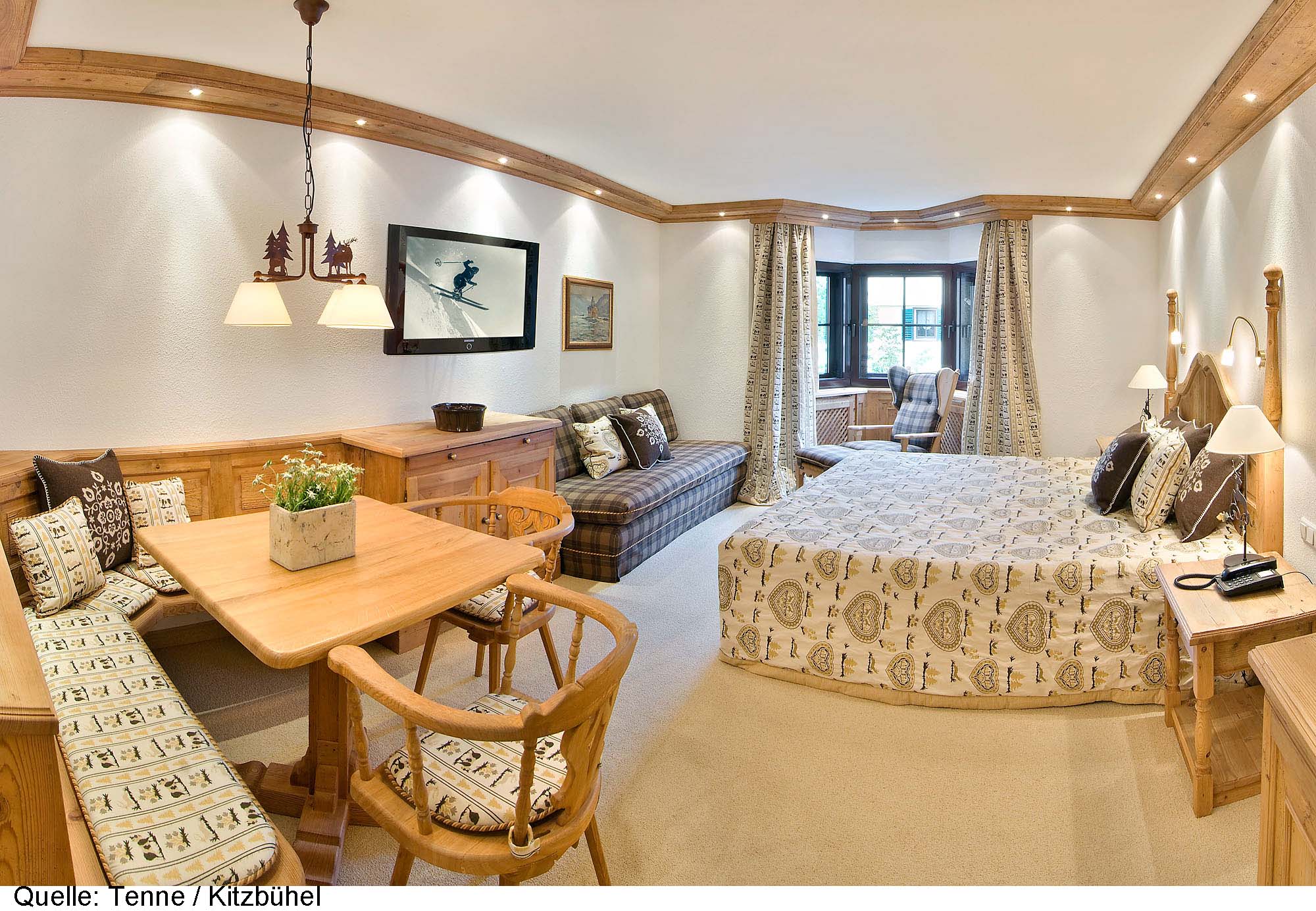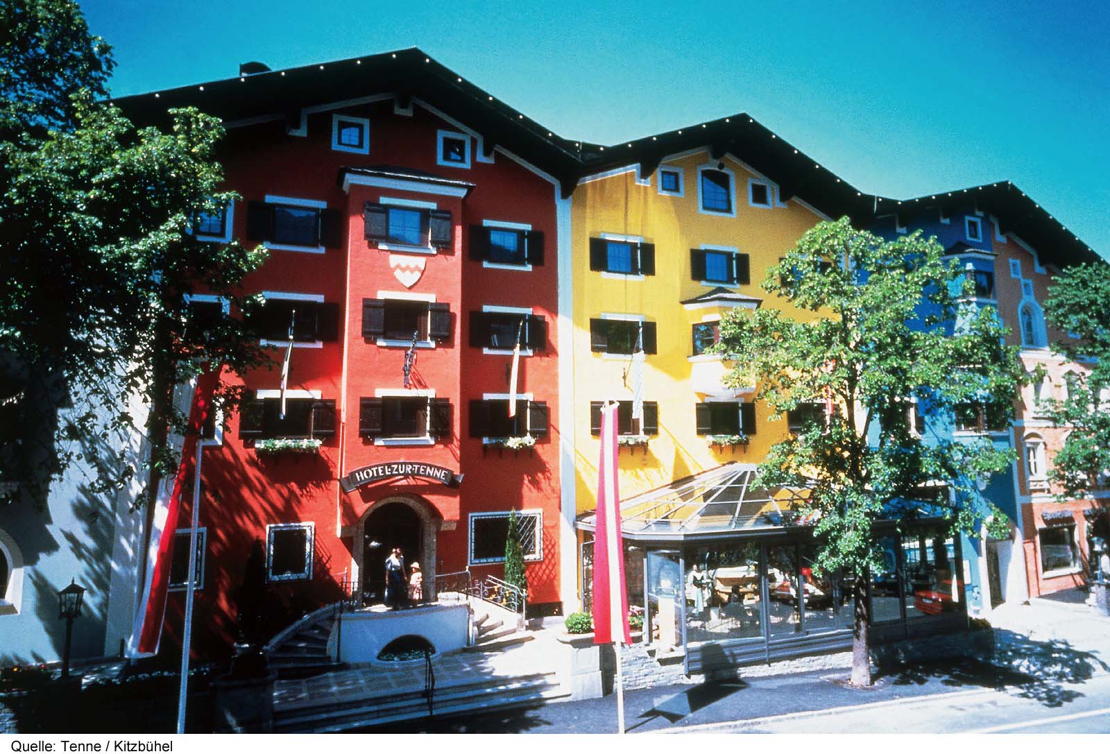 Hotel Zur Tenne är ett klassiskt, elegant lyxhotell med suverän service, beläget i hjärtat av gamla stan med affärer, restauranger och nöjen inom kort gångavstånd. Här bor du i stora, charmiga rum och sviter, alla individuellt inredda i en lantlig, tyrolsk stil. Varje våning har sin färgskala (blå, röd, beige) och du möts av en varm och hemtrevlig miljö med hög komfort. Vissa rum/sviter med balkong och de flesta sviter har egen öppen spis. Alla rum och sviter är utrustade med bl.a. platt-TV med kabelkanaler och SKY, kassafack och minibar. För din bekvämlighet finns badrockar och tofflor. Det finns tre delar av restaurangen, "Kaminstube", med öppen spis, "Winter Garden" med utsikt över byn samt "Jagastube" inrett som en jaktstuga i bergen. Var du än sitter äter du fantastiskt gott! I anslutning till receptionen finns en gemytlig rustik bar som förutom goda drinkar och kaffe serverar enklare snacks. Hotellet har elegant wellness med bubbelpool, bastu och ångbad, motionsrum samt möjlighet till olika skönhetsbehandlingar. Skidförvaring finns vid Hahnenkammbahn. Skidbuss saknas