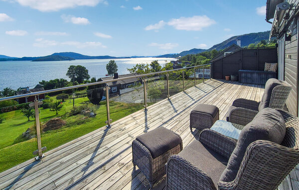 Se fram emot detta fantastiska semesterhus med vackra panoramaterrasser, en stor trädgård och hisnande utsikt över fjordlandskapet.