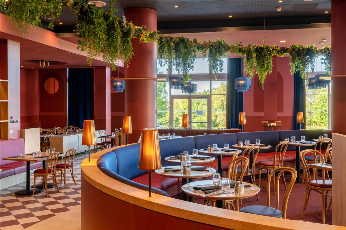 På restaurangen "Chez Maurice" njuter du av maten i dekorativ miljö med varma toner av rött och gult. Under sommaren öppnar restaurangen terrassen med utsikt över trädgården.