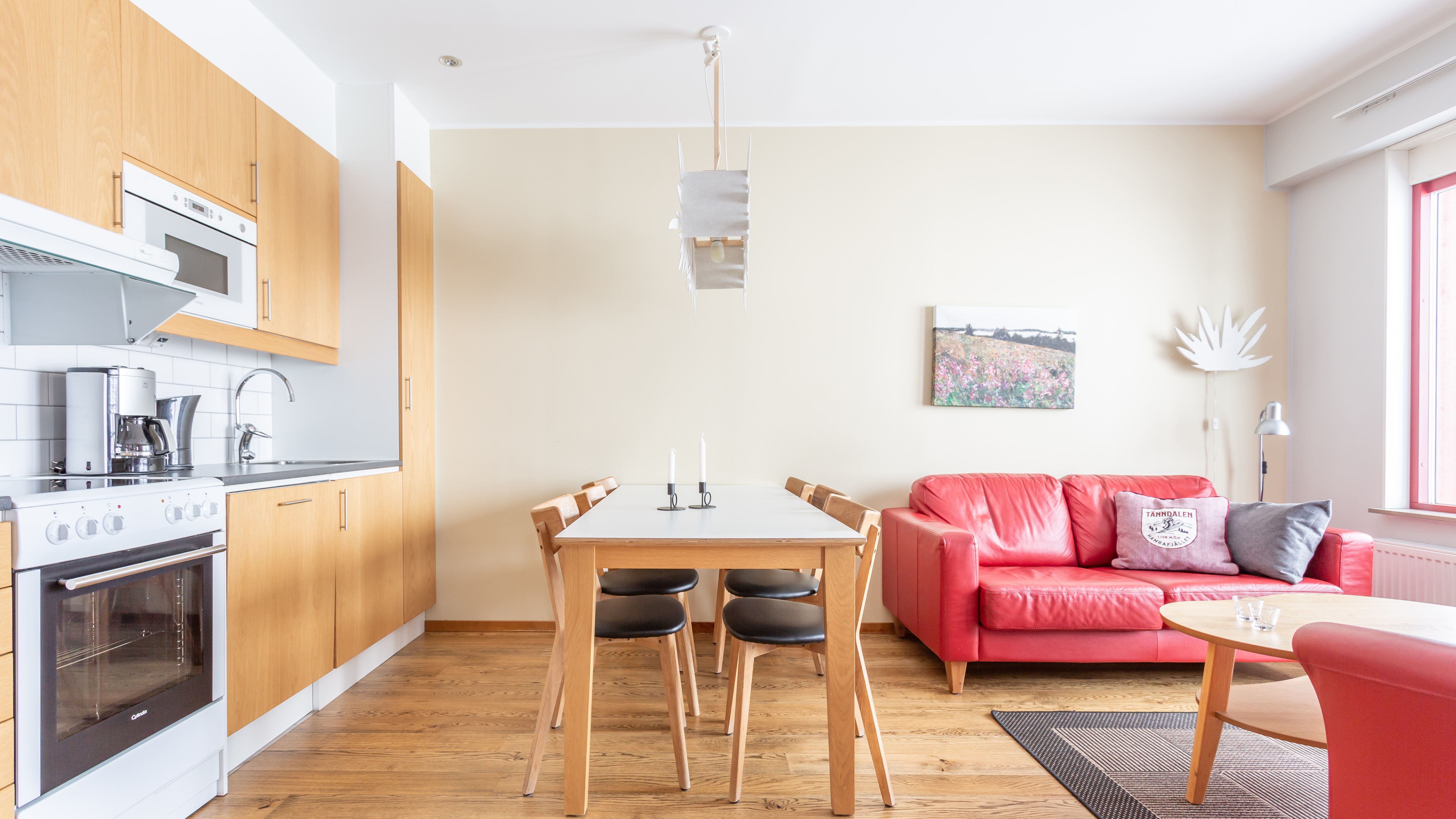 Allrum Kombinerat vardagsrum och kök med en trevlig matplats och TV-hörna med soffa och fåtöljer.