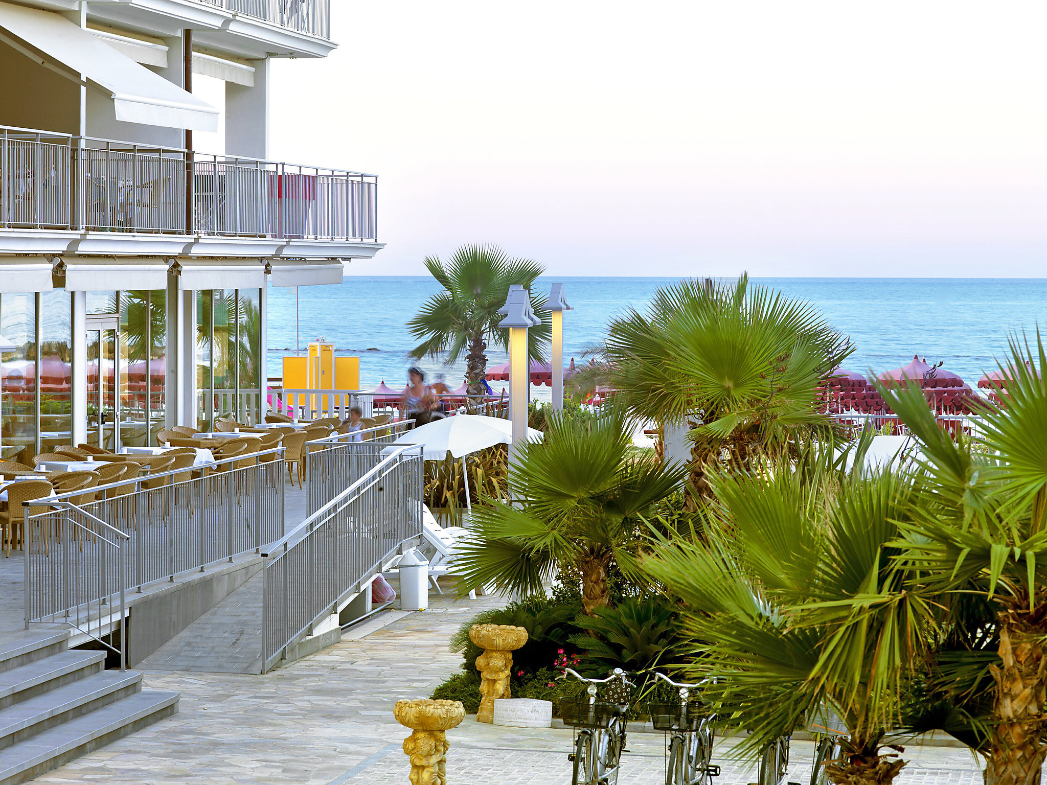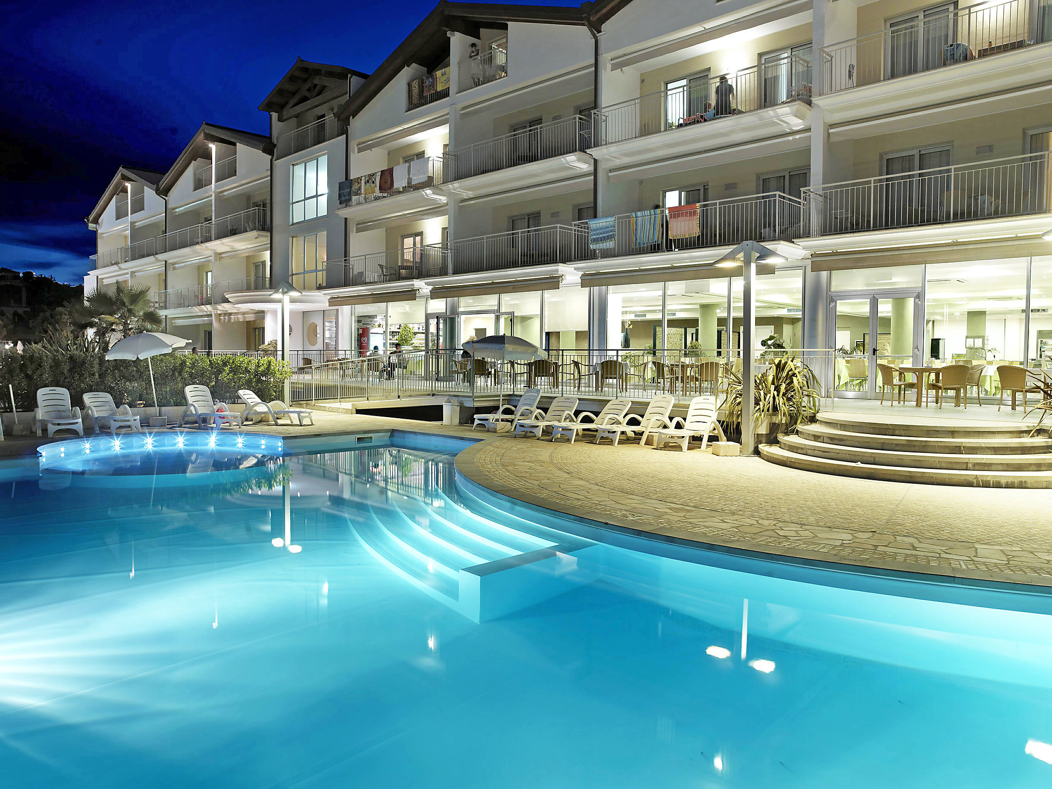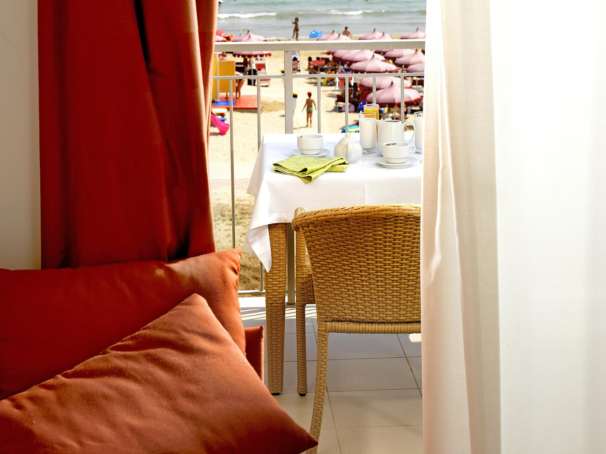 Residens "Casa del Mar". 1 km från centrumet av Roseto degli Abruzzi, soligt läge, 10 m från havet, 10 m från stranden, direktaccess till stranden. För gemensamt bruk: trädgård, pool skyddad (20 x 9 m, 140 - 220 cm djup, 28.05.-10.09.). Utedusch. På semesterhusområdet: reception, restaurang, Trådlös LAN [WLAN], hiss, tvättmaskin (för gemensamt bruk, extra), cyklar för uthyrning. Byte av sängkläder (extra). Byte av handdukar (extra). Städning på begäran (extra). Parkering (begränsat antal, extra), gemensamt garage (extra). Affär 1 km, livsmedelsaffär 1 km, stormarknad 800 m. Cykelväg 20 m. Beakta: underhållning under högsäsongen. Lämplig för barnfamiljer, babyutrustning på förfrågan. Järnväg i närheten. Bilden är bara ett exempel på ett hus. På den här semesteranläggningen finns det fler lediga bostäder!. 2-rums-lägenhet 32 m2 på 3. våningen. Sluttande tak, komfortabelt och gemytlig inredd: vardags-/sovrum, takhöjd 280 - 152 cm med 1 bäddsoffa för 2 personer och sat-TV. 1 dubbelrum med snett tak, takhöjd 280 - 152 cm. Kokvrå (4 kokplattor, ugn, frys). Dusch/bidé/toalett. Luftkonditionering. Liten balkong. Utsikt mot havet. Beakta: lämplig för barnfamiljer. 1 litet husdjur/hund tillåtet.