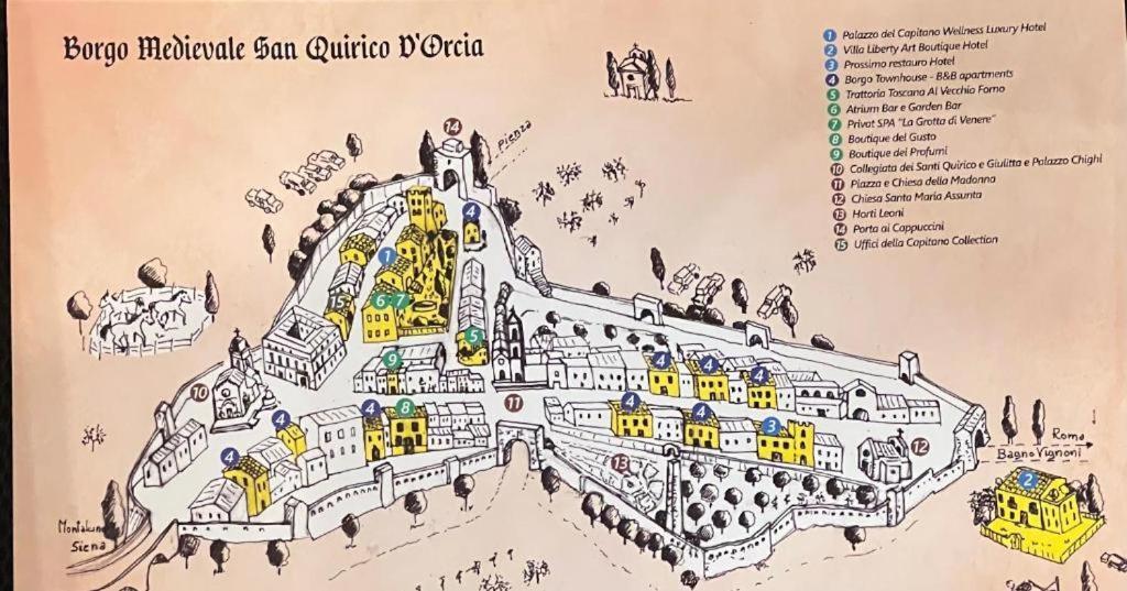 Boutique Villa Liberty - Depandance Hotel - Borgo Capitano Collection - Albergo diffuso ligger i San Quirico d'Orcia i ett historiskt område, en kort 5 minuters promenad från Horti Leonini och 5 minuter från Palazzo Chigi. Detta värdshus i lyxstil ligger 0,7 km från San Quirico-kollegiatkyrkan och 3,6 km från Poggio Grande. Känn dig som hemma i ett av de 18 individuellt inredda rummen med minibarer och platt-tv. Sängen har bäddmadrass, duntäcken och sängtillbehör av högsta kvalitet. Gratis wi-fi gör att du kan hålla dig uppkopplad, och satellit-tv erbjuder underhållning. Badrum med dusch, regndusch och lyxtoalettartiklar. Avstånd avrundas till närmsta decimal.