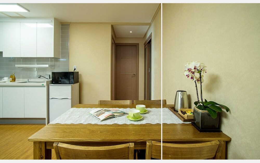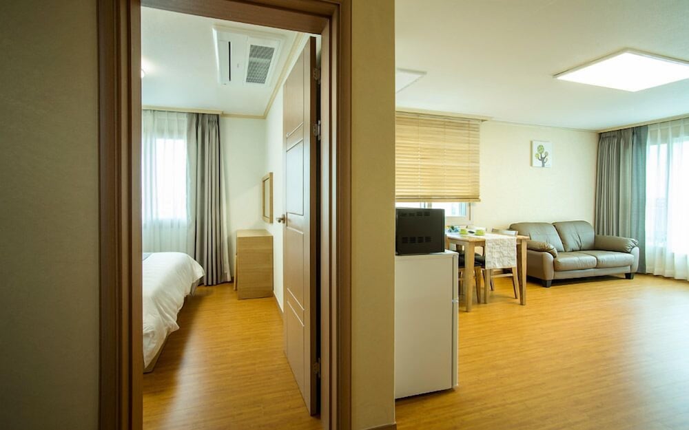 Haerian Hotel ligger centralt i Seogwipo, en kvarts bilfärd från både Seogwipo Maeil Olle-marknad och PLAY K-POP. Detta hotell med golfbana ligger 15,8 km från Jeju Shinhwa World och 1,3 km från Ripley's Believe It or Not Museum. Känn dig som hemma i ett av de 22 rummen som har pentry med kylskåp och spishäll. Gratis wi-fi ser till att du kan hålla dig uppkopplad, och en 40-tums platt-tv med kabelkanaler erbjuder all underhållning du behöver. På rummet finns skrivbord och mikrovågsugnar. Städning erbjuds dagligen. Avstånd avrundas till närmsta decimal.