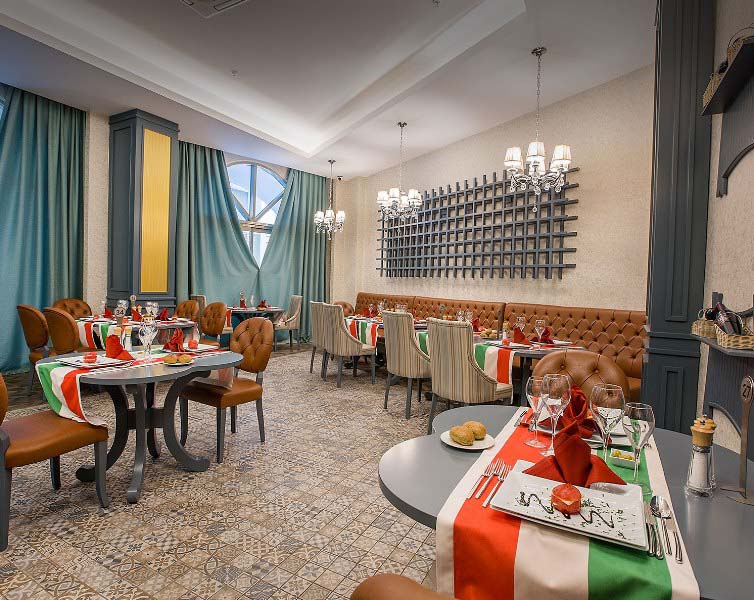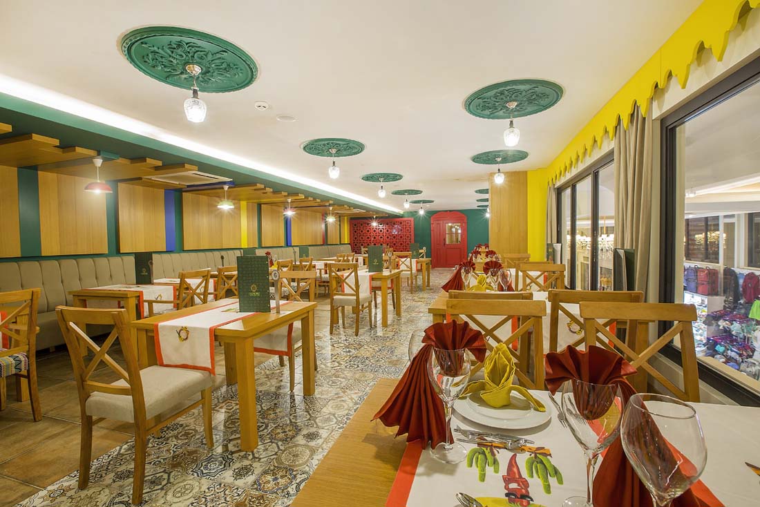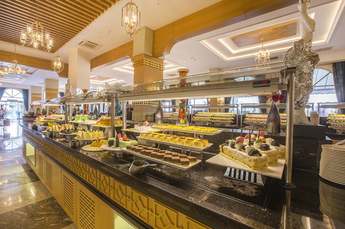 I din vistelse ingår all inclusive där alla måltider, drycker och snacks ingår. Måltiderna serveras vanligen i bufféform i huvudrestaurangen. Här kan du smaka på lokala rätter från Turkiet, men även mat från andra delar av världen. Tröttnar man på bufférestaurangen så ingår ett besök per vistelse i någon av hotellets fem à la carte-restauranger med olika inriktning (vissa mot avgift). Enklare midnattsnacks serveras mellan 22.00-07.00. Varma och kalla samt lokalt producerade alkoholhaltiga drycker ingår mellan 09.00-02.00. Vissa importerade drycker och färskpressad fruktjuice samt dryck och vin på flaska - mot avgift