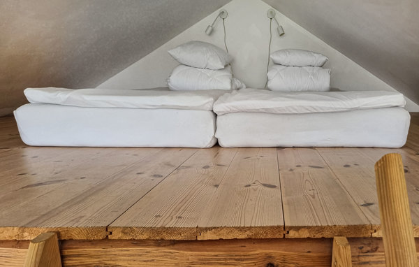 Huset ligger nära en järnväg, det finns en bullerskärm. Sovloftet har lågt i tak.