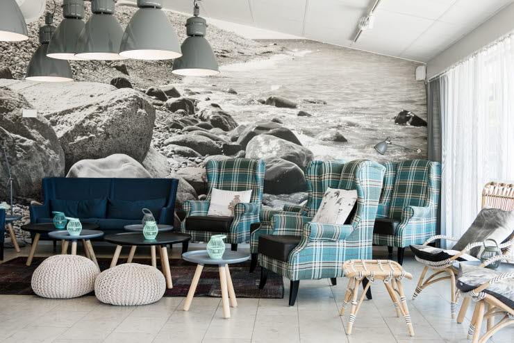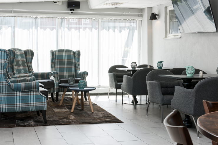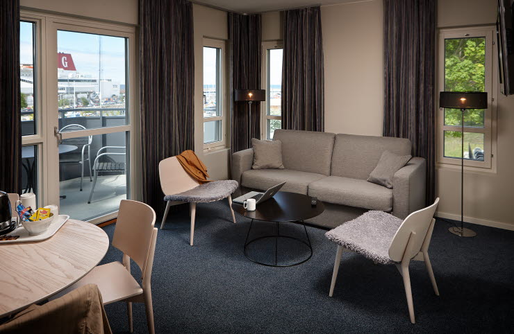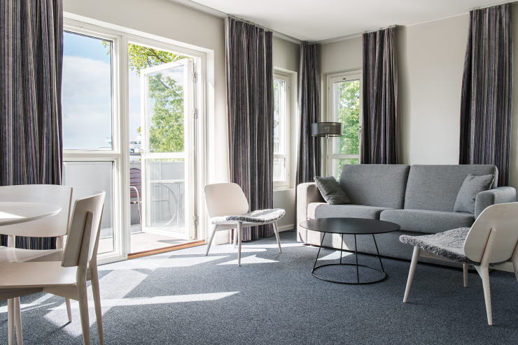 Rummen är moderna och inredningen i skandinavisk design. Många av rummen i markplan har en egen möblerad uteplats.